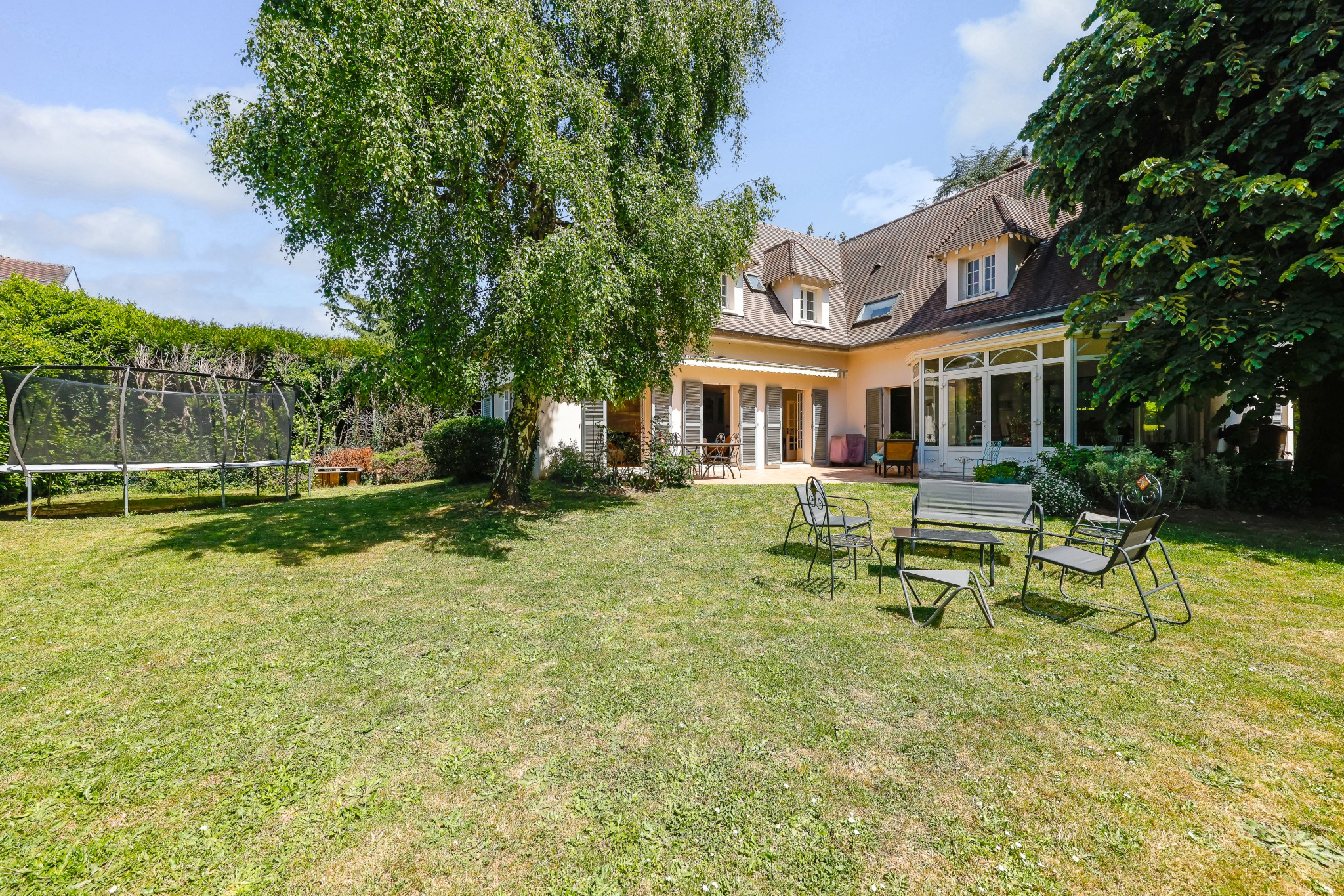 Le rez-de-chaussée débouche sur une belle entrée avec wc invités, qui dessert la cuisine dînatoire de 36 m² entièrement aménagée et équipée, ouverte sur une superbe véranda lumineuse, le vaste séjour double de 55 m² parqueté et avec cheminée design qui donne sur la terrasse et le jardin. Enfin un bureau, espace dressing et une buanderie complètent ce niveau.